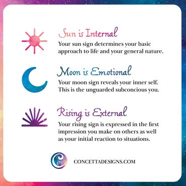 Our Sun, Moon and Rising/ Ascendant signs play a major role in who we are- how we feel, act and the impressions we leave on others. Sun is internal, Moon is emotional and Rising/ Ascendant is external. These are the three signs most commonly interpreted.